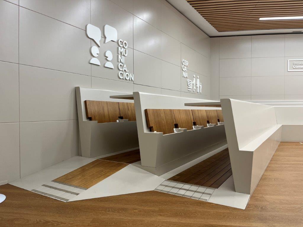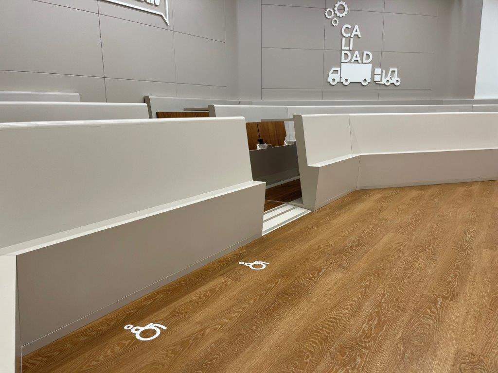 En todos los recorridos interiores de la Fundación Covirán no encontramos ni un solo obstáculo y todo el mobiliario es accesible para todas las personas, contando con reserva de espacios para personas usuarias de silla de ruedas, en función de las necesidades. Todas las puertas son de fácil apertura cumpliendo con los requisitos de accesibilidad, incluso los extintores están sobre soportes en el suelo y colgados a alturas que permiten el alcance fácil a todos los usuarios y facilitan su localización a personas con limitación visual, evitando que puedan tropezarse con ellos.